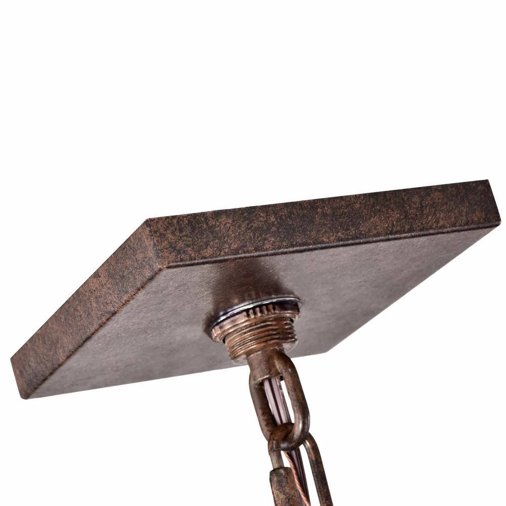- Pendant light suspends from a chain 60 in. H, where it anchors with a square canopy