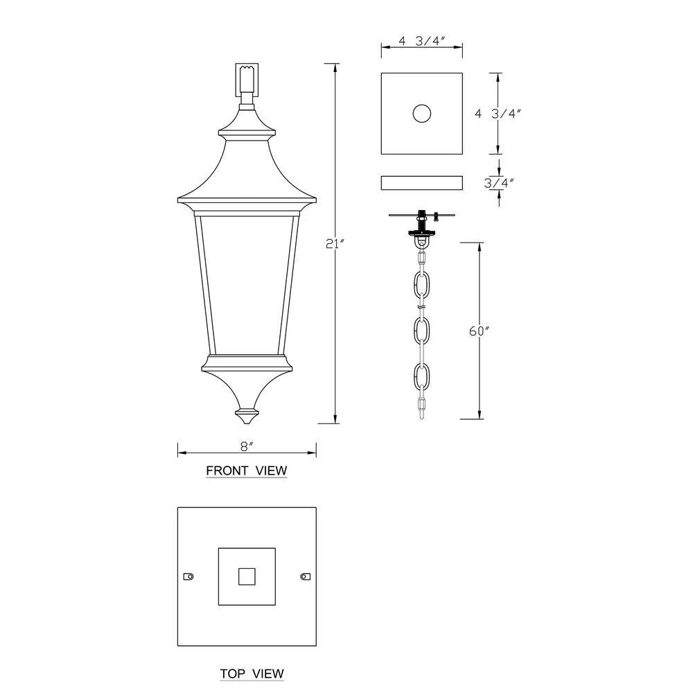 - Pendant is 8 in. W x 8 in. L x 21 in. H and the length of the chain is 60 in.