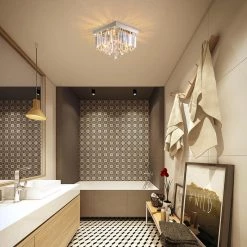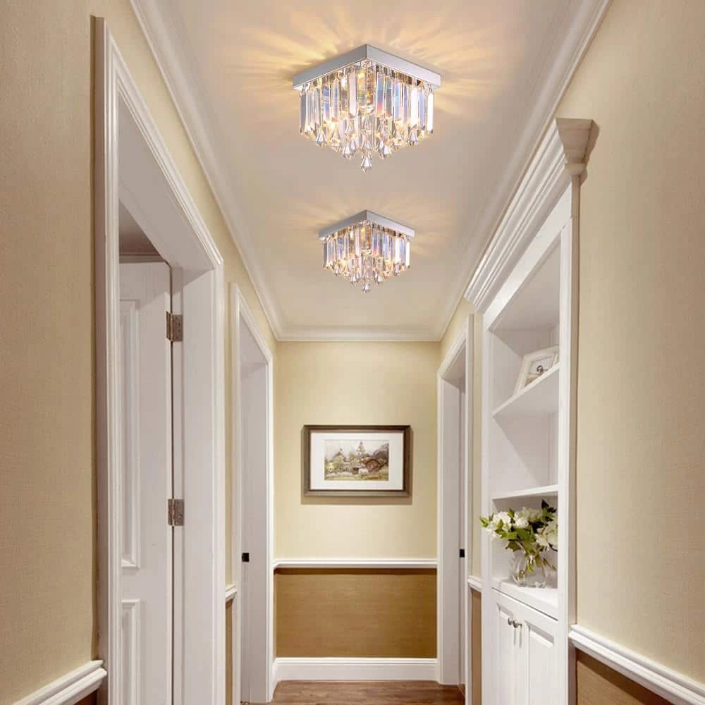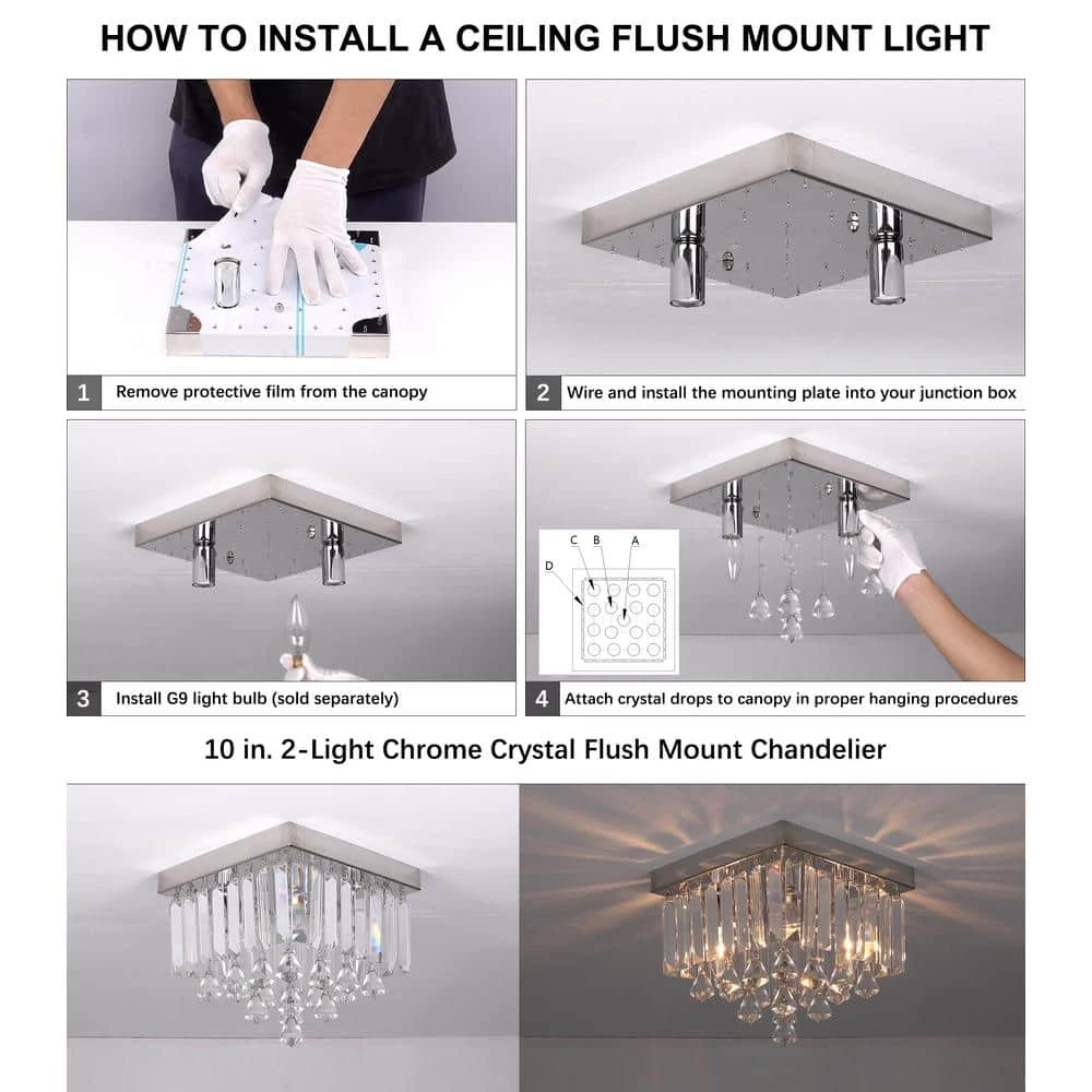 10 in. 2-Light Chrome Modern Chandelier Square Ceiling Flush Mount Lighting is a perfect fixture for a dining room, hallway, porch or over a kitchen island. The modern contemporary chandelier made out of hand-picked crystal and stainless steel. Besides, its brightness and color temperature can be altered to meet your requirement of light color(bulbs and switch not included).