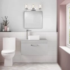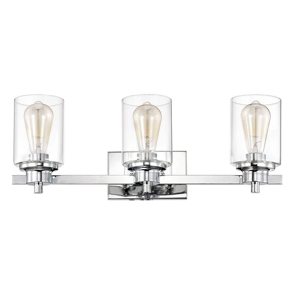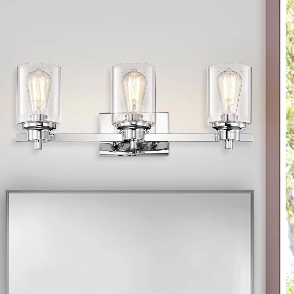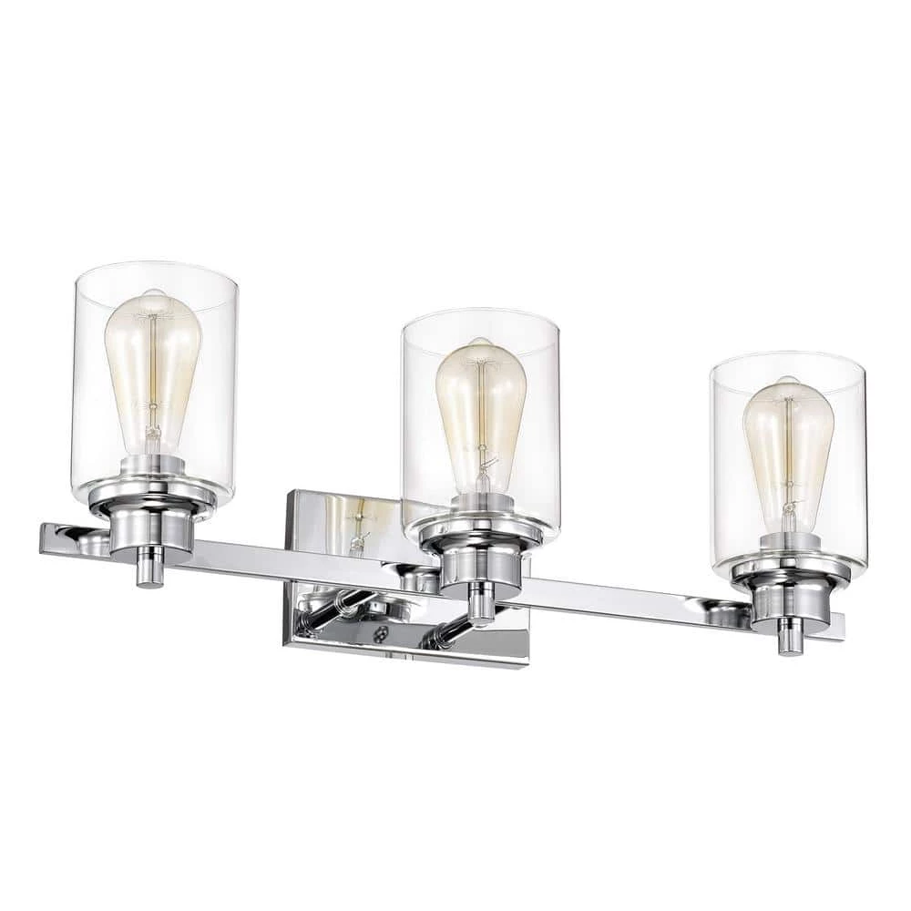 This vanity light is a perfect example of classic style redesigned for today’s home. With its transitional design and stylish chrome finish combination, this vanity light will be the star of your bathroom or vanity area. The clear glass shades bring style and sophistication to this fixture and the shades can face up or down. This light fixture is designed for damp locations such as over bathroom sinks and vanity areas, it’s easy to install and built to last.