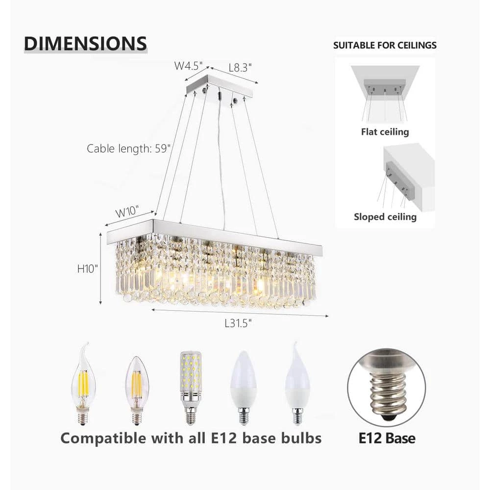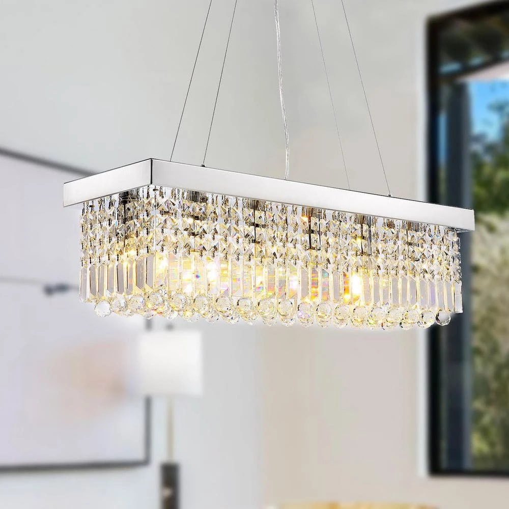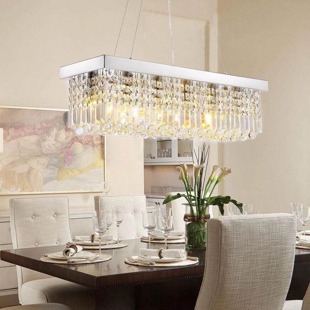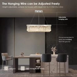 This modern/contemporary crystal chandelier is a great art decoration for your kitchen island, dining room with any style of your home. This rectangular pendant light is made of great quality metal and top grade K9 crystals which will add an elegant atmosphere to your house. This transitional island chandelier is suitable for some rectangular places, such as dining room over rectangular table, kitchen island, bar, restaurant, cafe, shops, waiting room, hotel, beauty salon, etc.