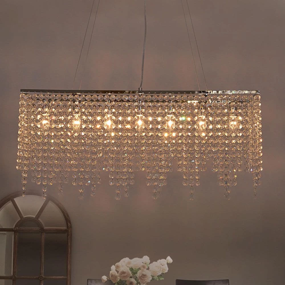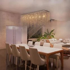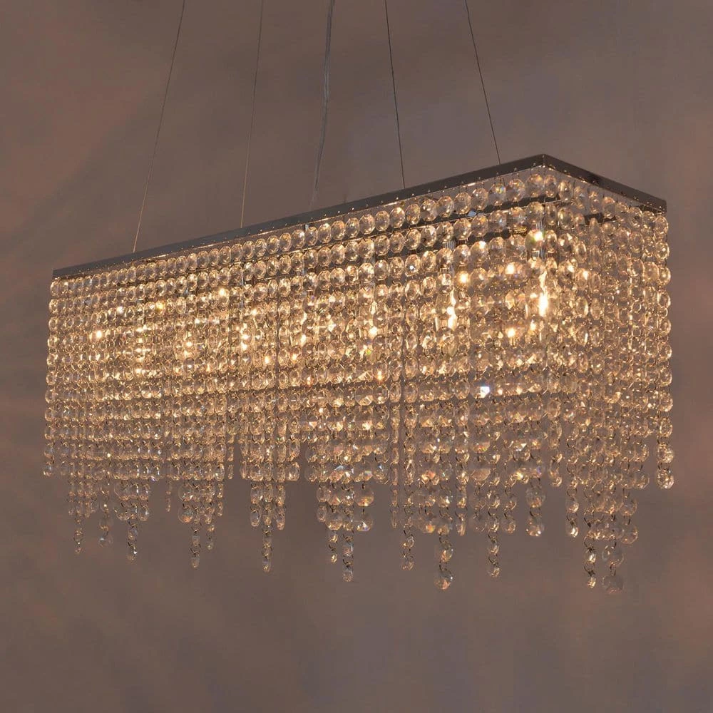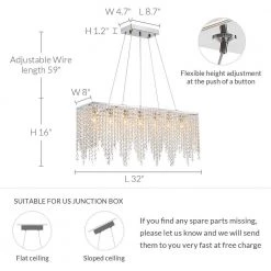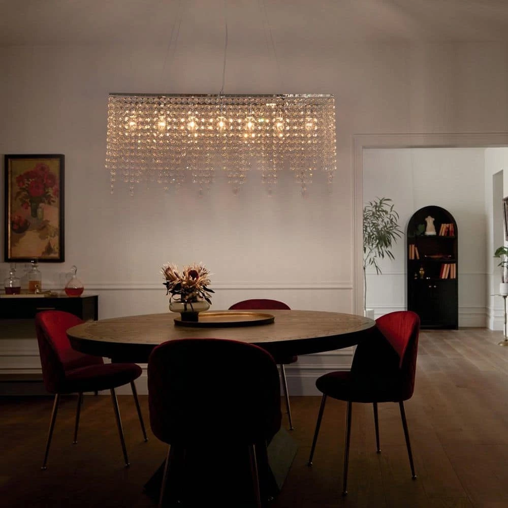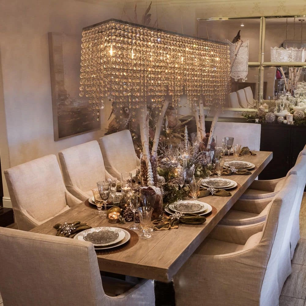 Elegance and glamour will illuminate the room with crystal chandelier collection. Add a decorative and functional finishing touch to a living room, dining room, bathroom or entry. Suit for your Christmas Eve dining table decoration. This rectangle crystal chandelier light is dimmable when using dimable swith and light bulks. This light is as versatile as it is stylish. You can decorate any style of your home, such as modern, contemporary, farmhouse, transitional etc.