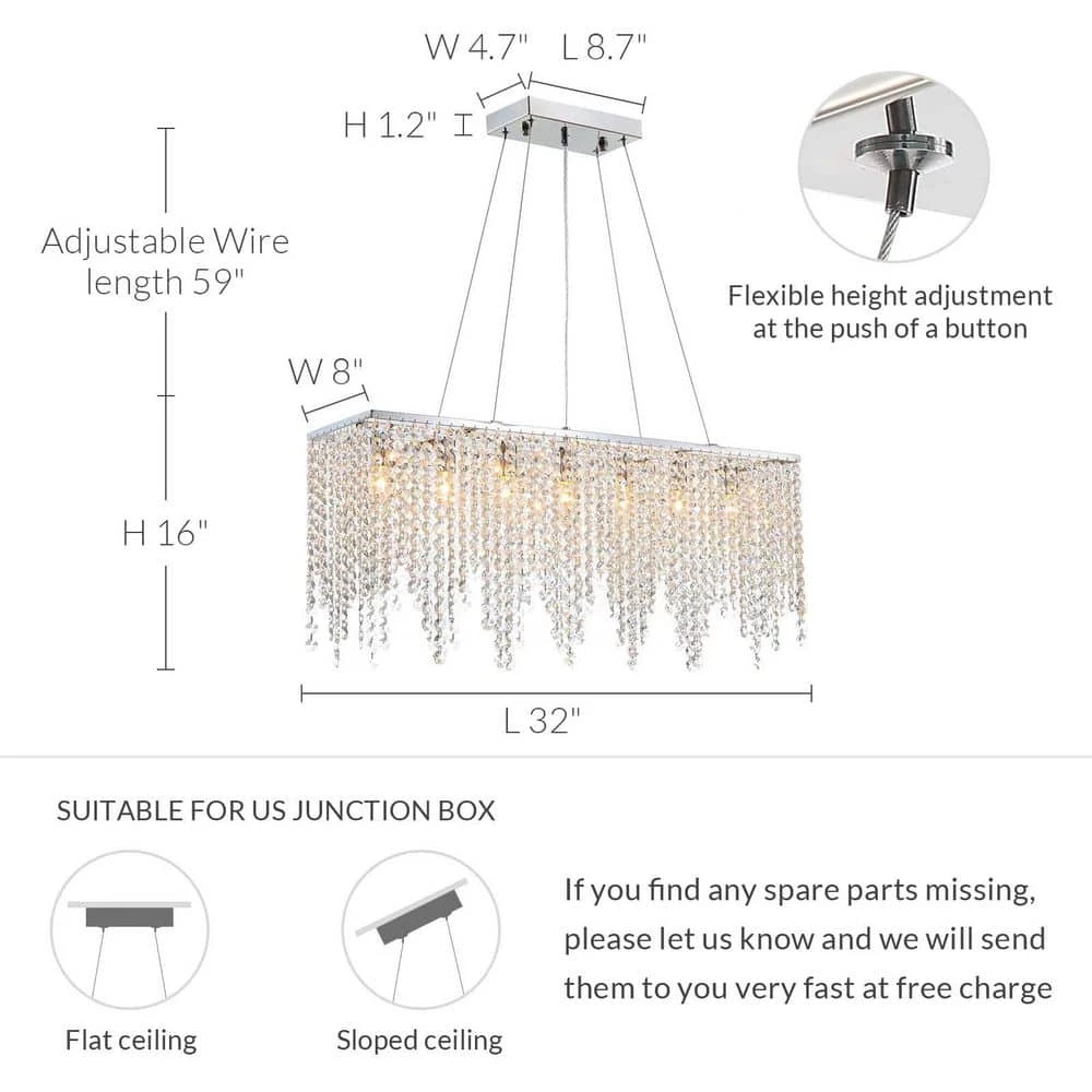 - Chandelier size: 32 in. L x 7.8 in. W x 16 in. H