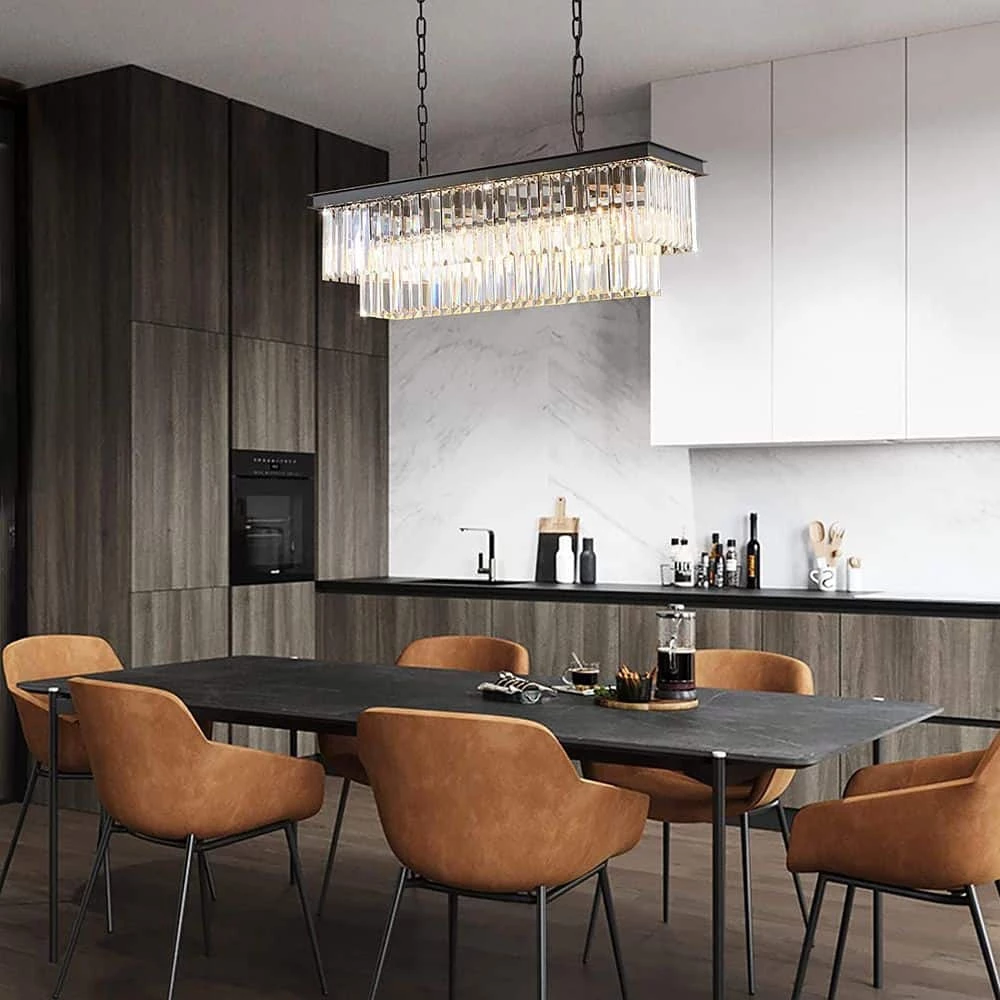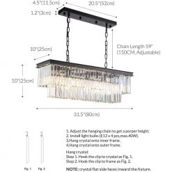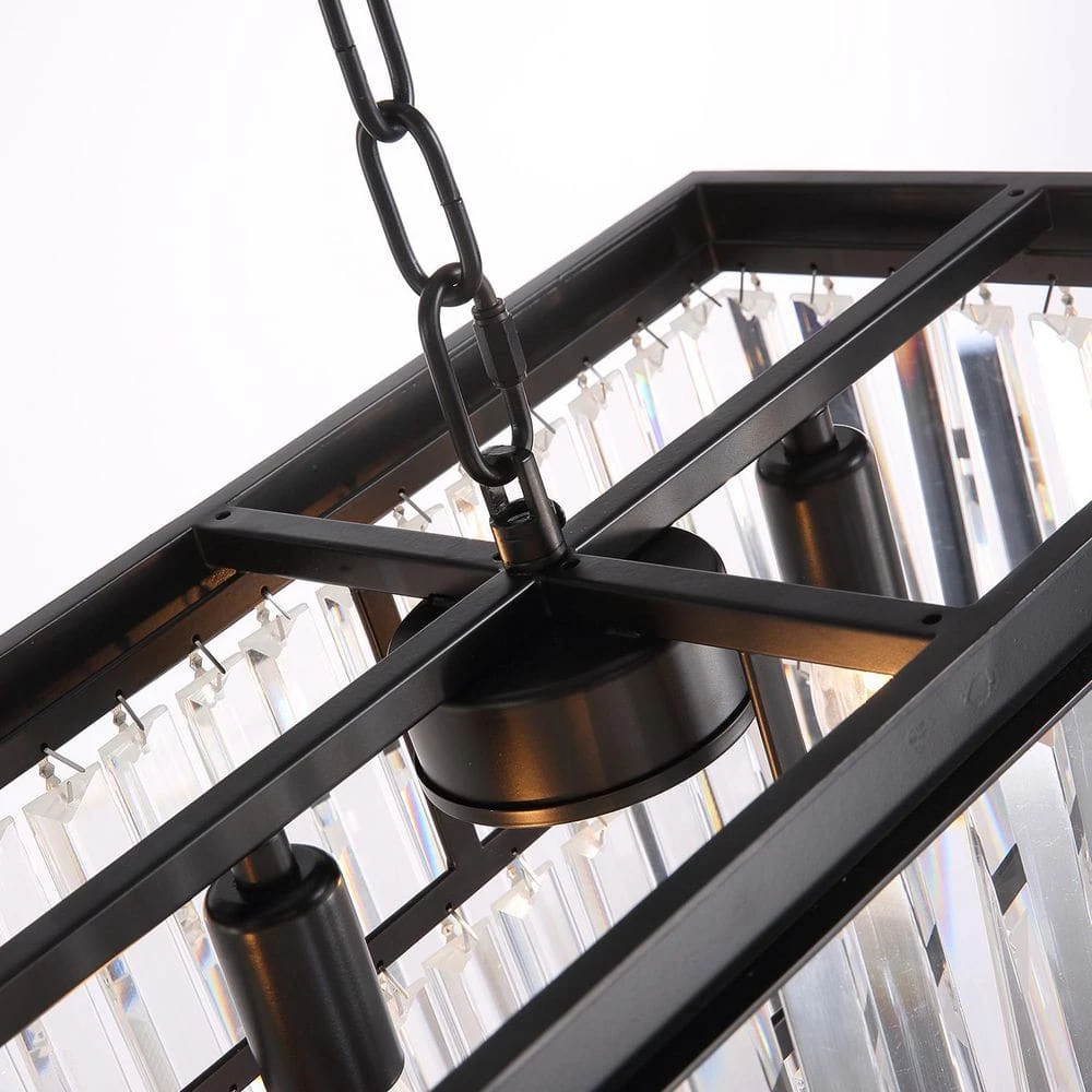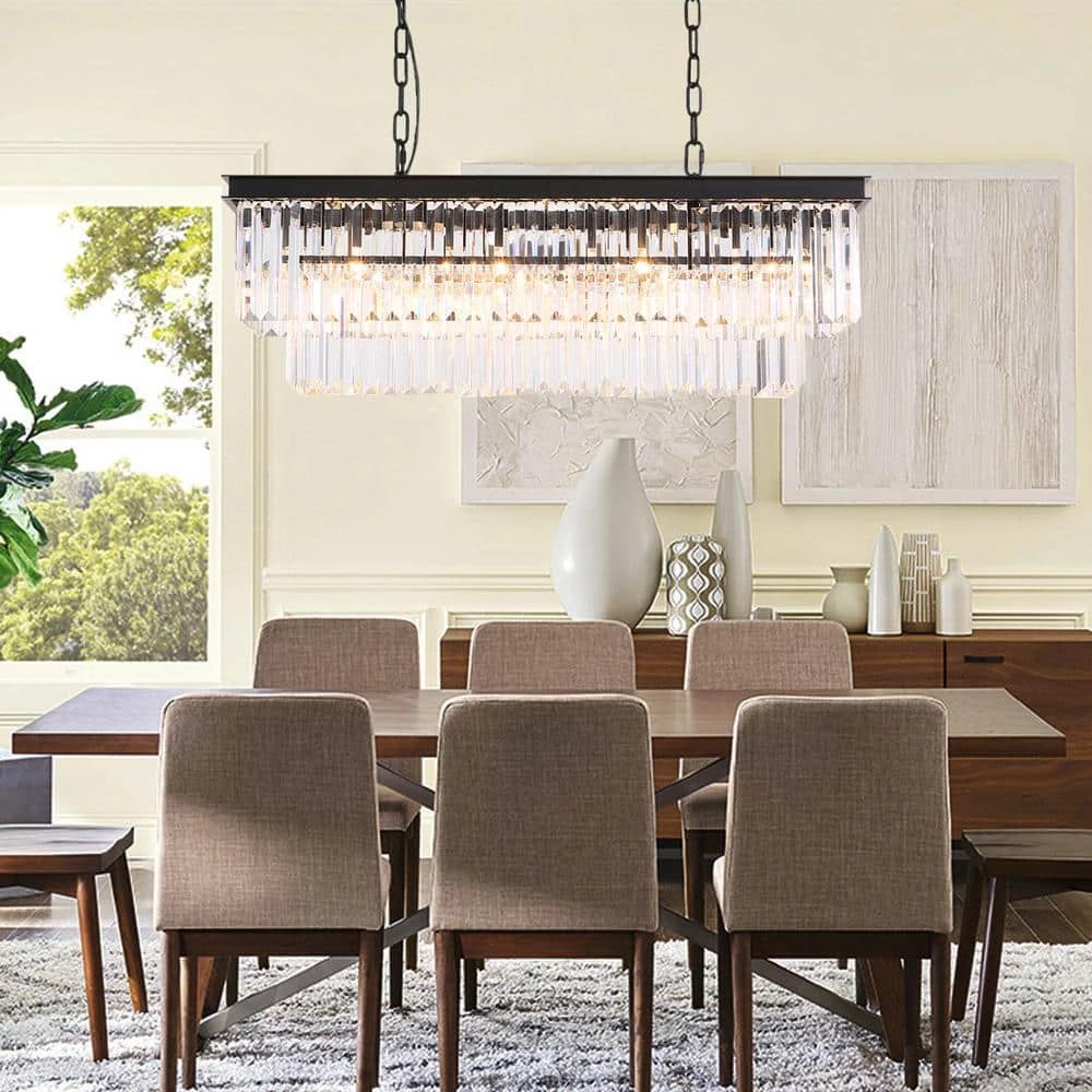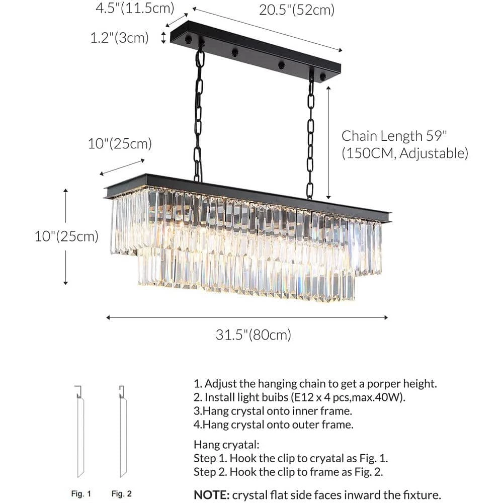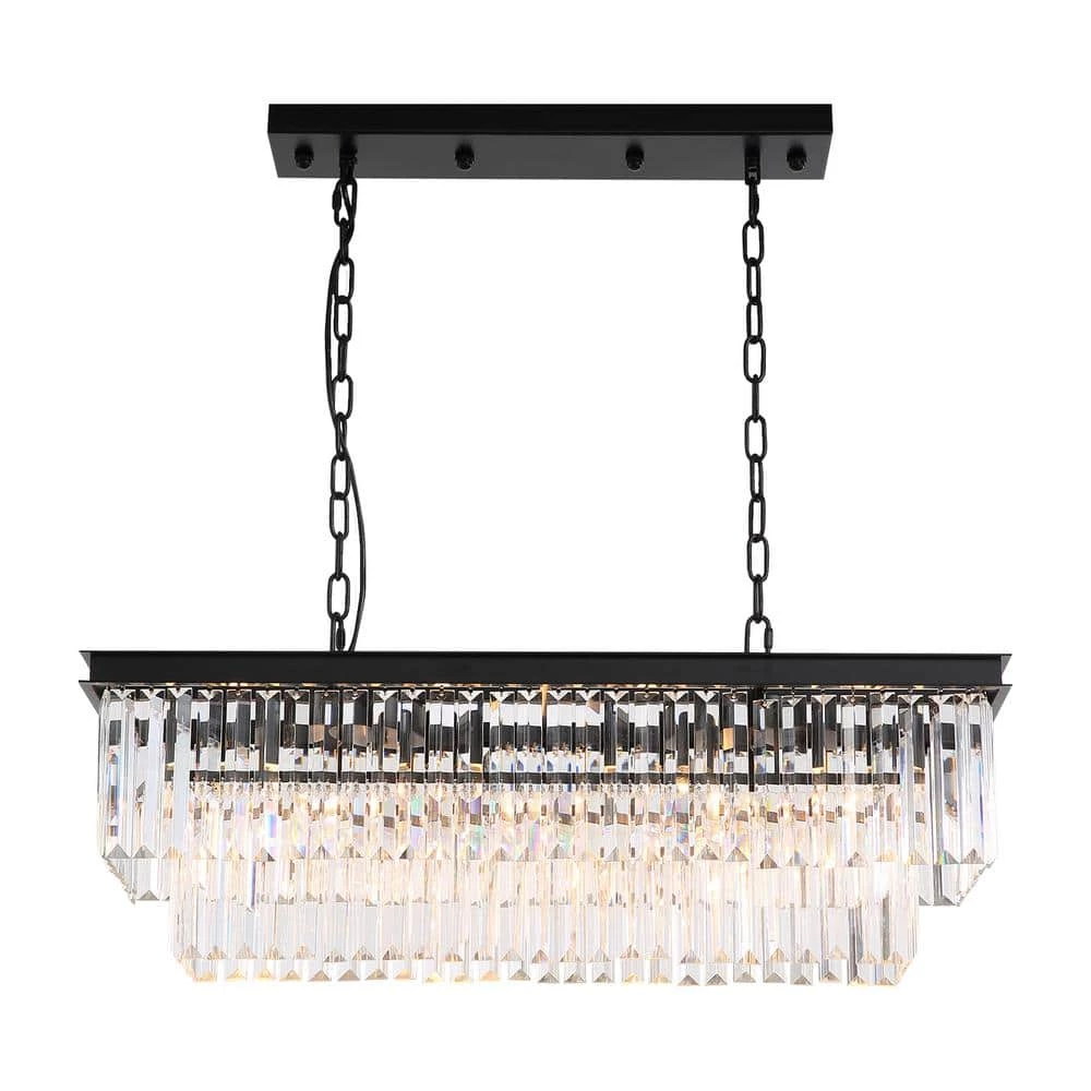 Modern Black Crystal Chandelier is perfectly centered over sprawling dining tables and breakfast bars, the rectangle 6-Light Modern Chandelier brings sparkle to your well-appointed spaces. Faceted crystal details cascade down, drawing the eye of your guests, while an iron base provides a clean, tailored edge. The crystal chandelier has an Adjustable Hanging length of 59 in. so you can change the length of the hanging chain to suit your room. This black chandelier lighting requires E12 bulbs x 6, max 40 W (bulbs not included),When connected to a dimmer switch, the light output can be adjusted, allowing you to set the mood accordingly (switch not included).