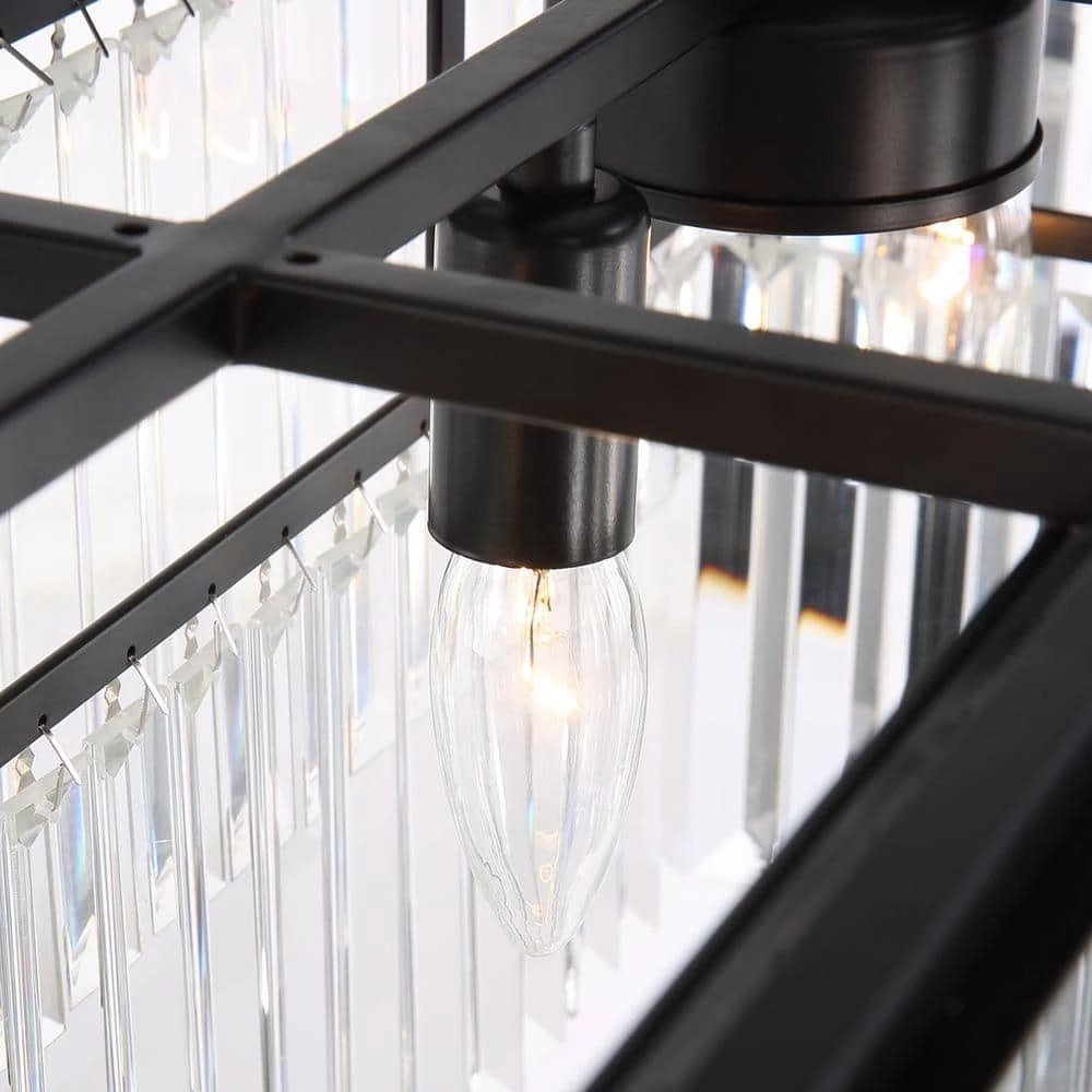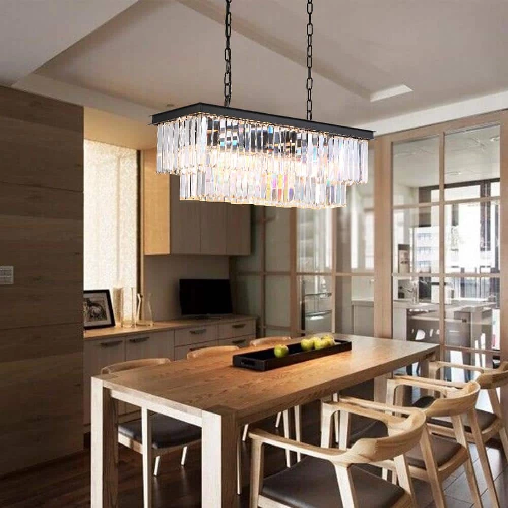 - 2-Tier Black Pendant Lighting: Features a rectangular profile crafted from clear crystal. Inside are glittering crystal droplets, which provide additional sparkle and eye-catching dazzle