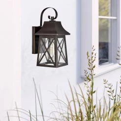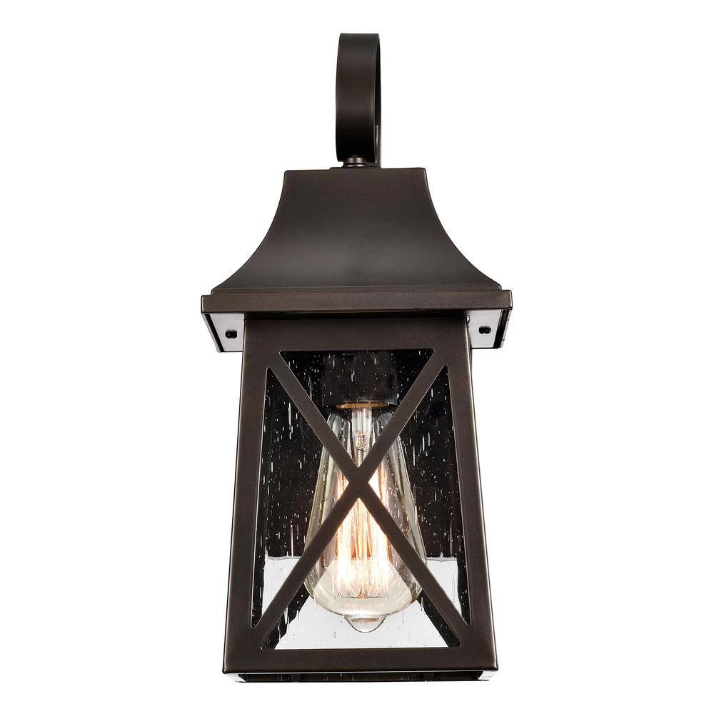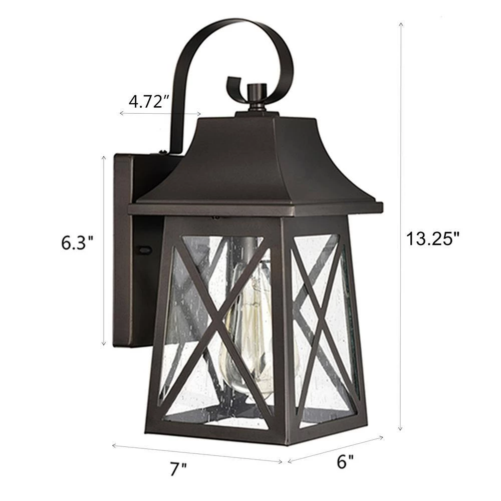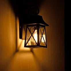 The classic and timeless rustic design will coordinate and compliment the exterior of your home. Weather resistant construction with a long-lasting powder-coated finish make this fixture an outstanding value. The rugged steel lantern protects the glass shade and adds an interesting design element. Use up to a 60-Watt incandescent light bulb (or equivalent LED bulb) for more light and added security.