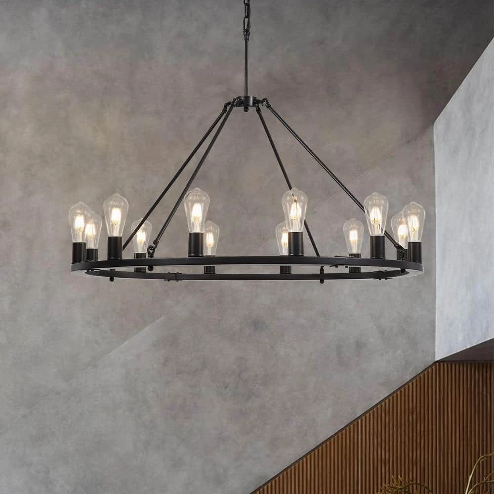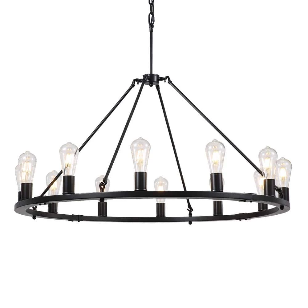 Bring a touch of brightness to your living room or dining room with this industrial 12-light chandelier. Perfect for dry locations, this metal fixture features a black finish and a round wagon-wheel shape that complements any home decor. This pendant light accommodates 12 of 40-Watt e12 bulbs (not included) and is compatible with a dimmer switch (not included) so you can set the ambiance of your space with ease.