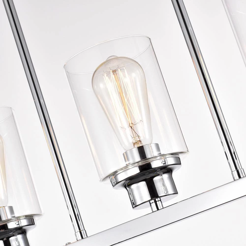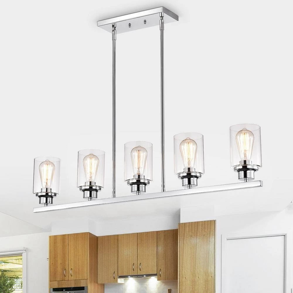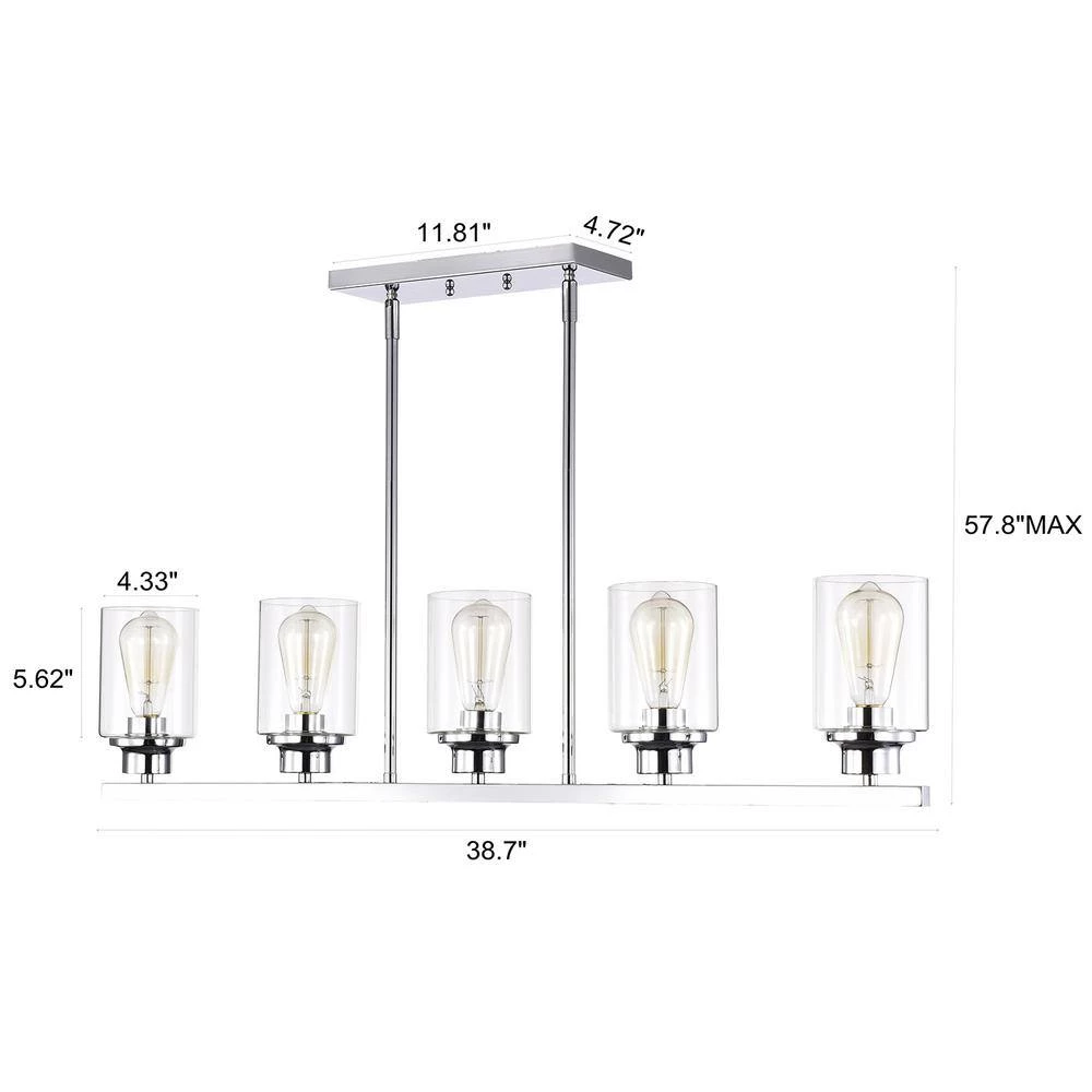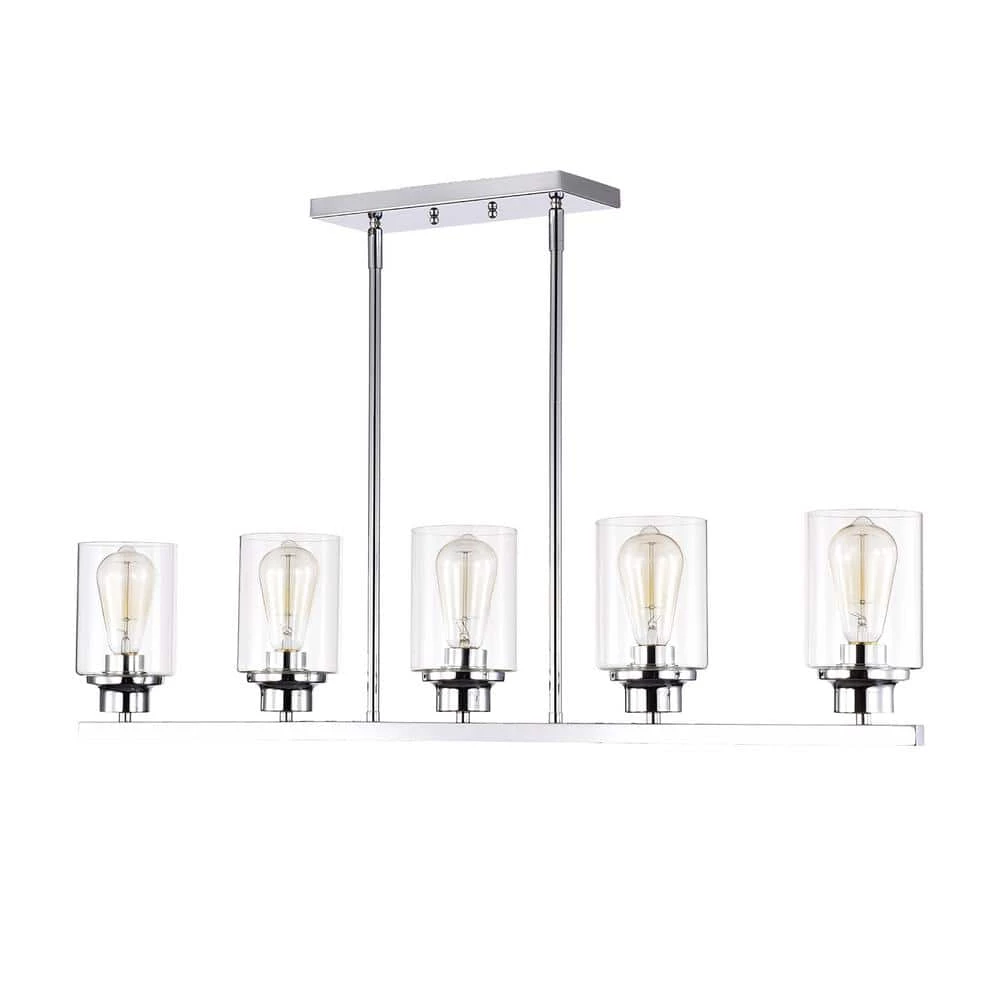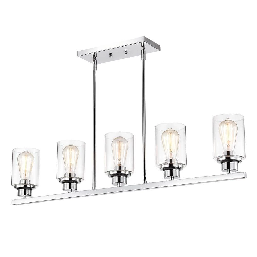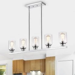 From front door foyers to kitchens, the 5-Light Pendant Light offers a sleek and versatile look with clean lines. Durably crafted with a chrome finish, the adjustable design accommodates a variety of ceiling heights and is easy to install with included instructions. The sleek metallic housing with clear glass shade, providing soft illumination for any space, especially ideal above a kitchen island.