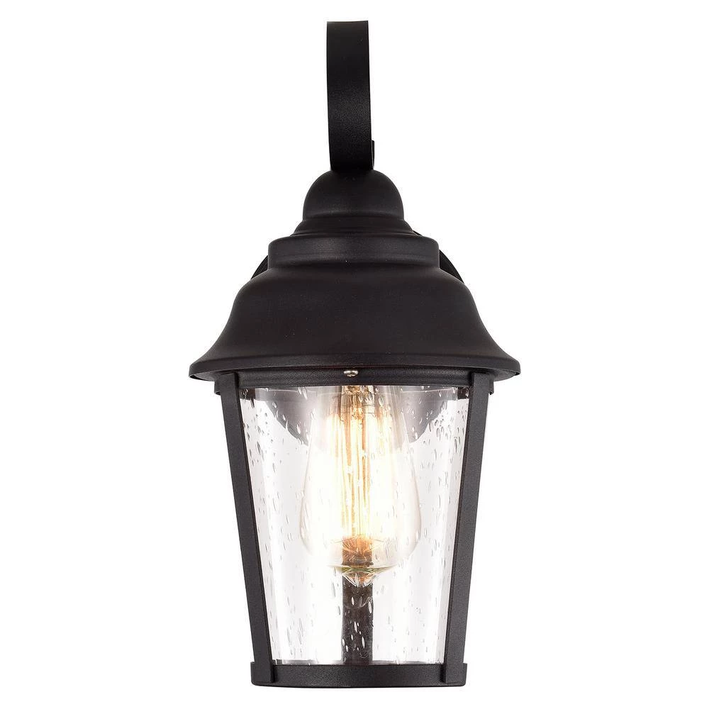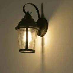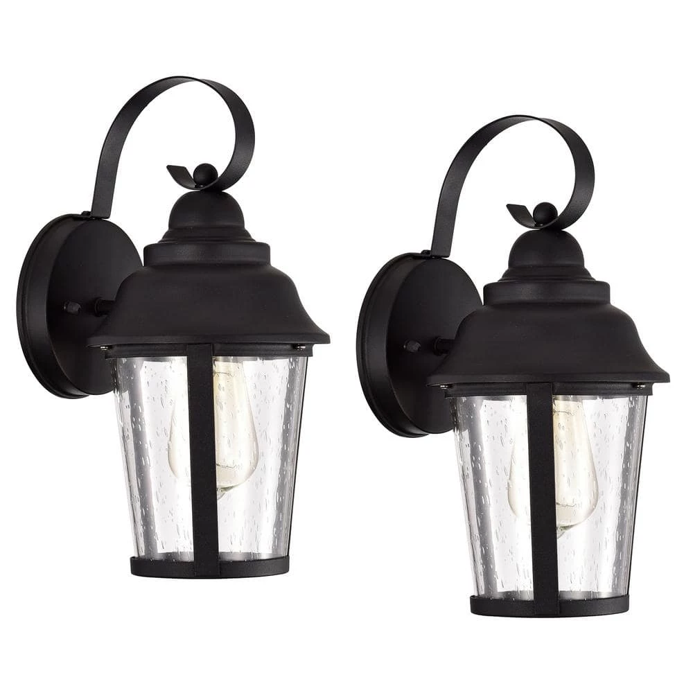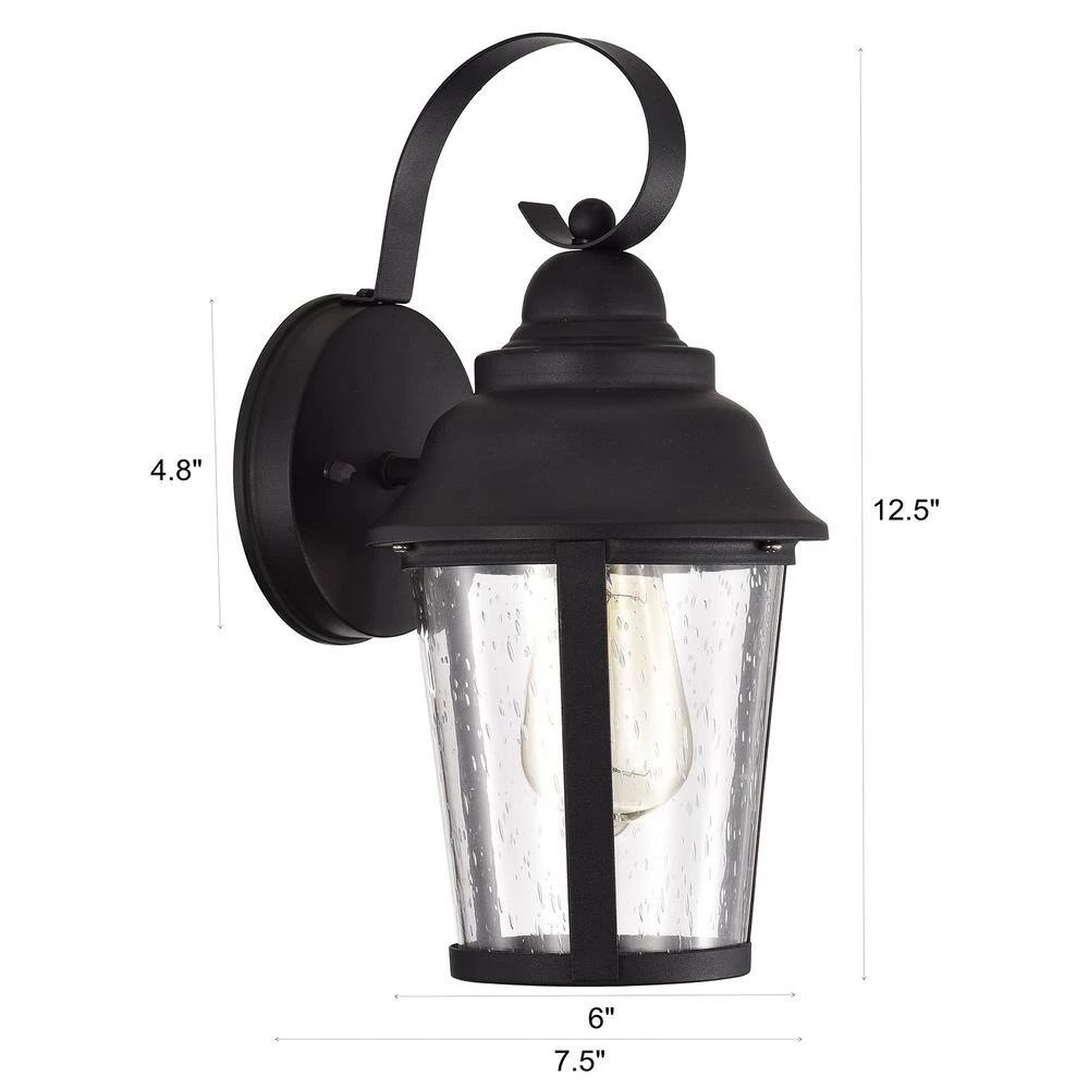 The classic and timeless rustic design will coordinate and compliment the exterior of your home. Weather resistant construction with a long-lasting powder-coated finish make this fixture an outstanding value. The clear glass sides and cylinder shaped frames are complimented by matching sloped roofs, allowing these wall lights to provide all-around illumination in porch areas, walkways and driveways. The rugged steel cage protects the glass shade and adds an interesting design element. Use up to a 60-Watt incandescent light bulb (or equivalent LED bulb) for more light and added security.