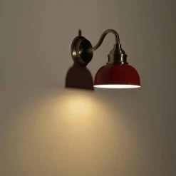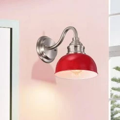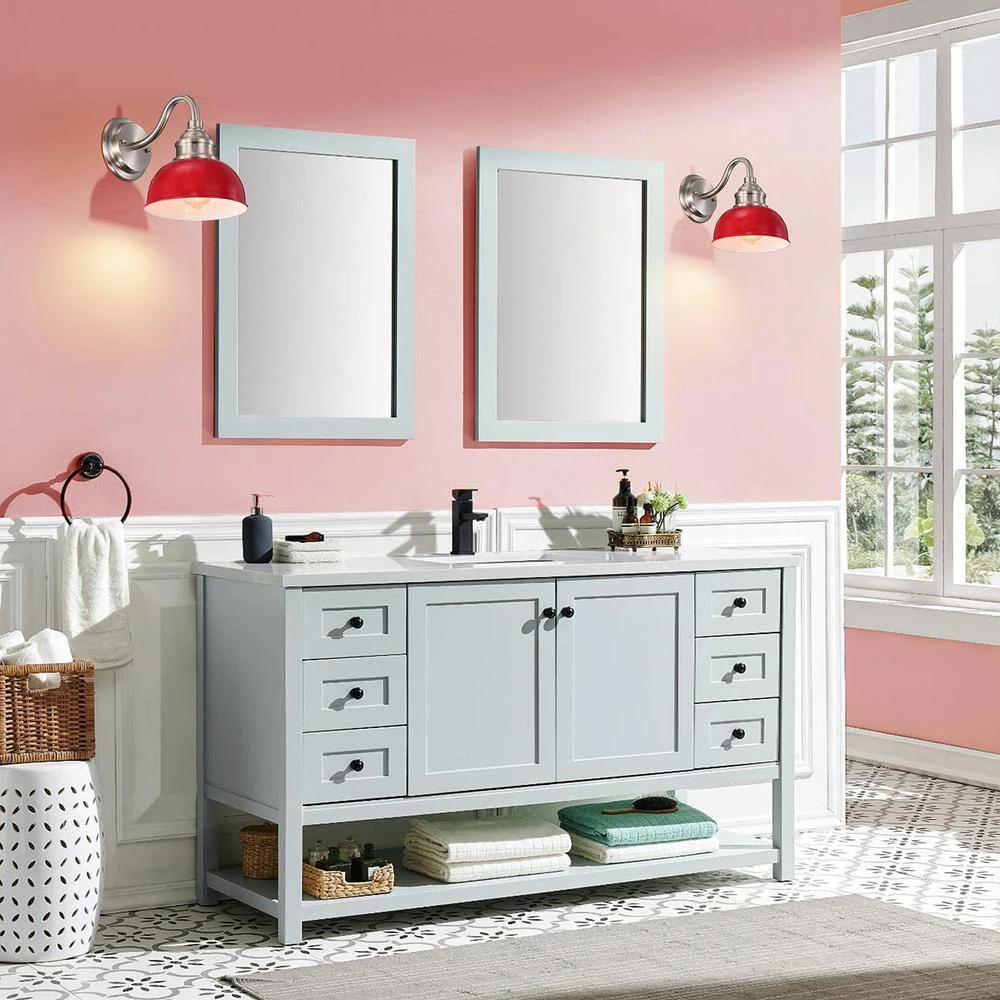 Bring your casual and cozy farmhouse design style to your master bathroom. With a red finish, this light vanity exudes plenty of country charm with the open barn style metal shades, allowing for plenty of downlighting for touching up makeup. For even more vintage charm, use a compatible Edison bulb to take advantage of the exposed bulb profile of these farmhouse shades.