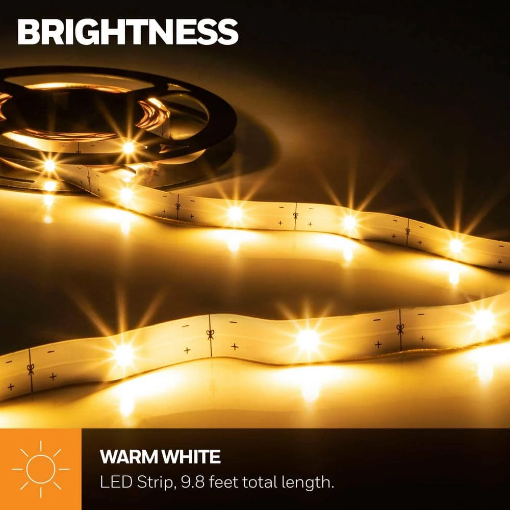 - Warm white lighting: warm white LED lights make up this 9.8 ft. strip light to add ambient lighting to any room in your home to provide a more relaxing environment