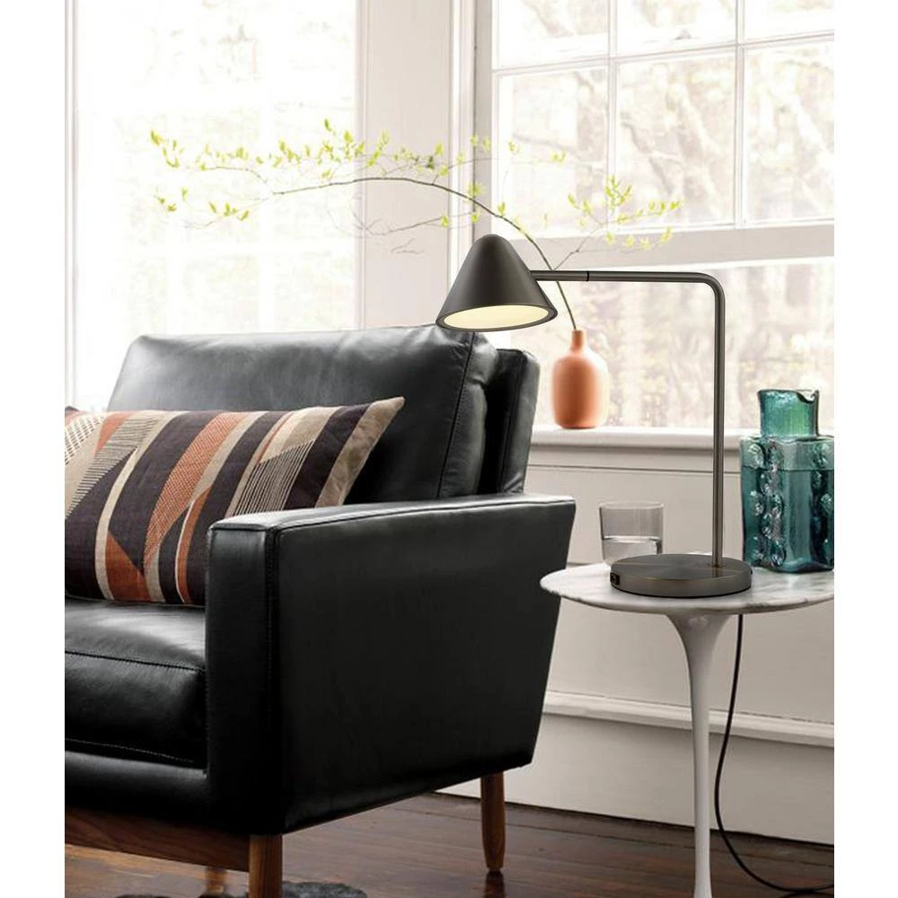 Keep it simple and functional with this matte black LED table lamp. Featuring a handy USB port for charging important devices, this adjustable desk lamp provides a LED light for precision in illumination. The clean lines and slender shape of the stem and angled arm as well as the conical shade give a geometric minimalist feel to the style. Add this energy-efficient lamp to a desk or workstation for reduced eye strain in reading or detail-oriented tasks. Functional, adjustable, bright, reading, LED, USB, bright, sustainable, energy-efficient,. USB port – Easy access to charge your phone or other devices. Long lasting, energy efficient, LED illumination excellent for reading. Adjustable to put the right amount of light right where you want it. Classic Contemporary design and LED technology. Reduces eye strain