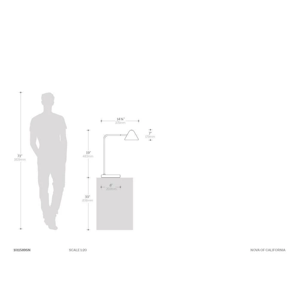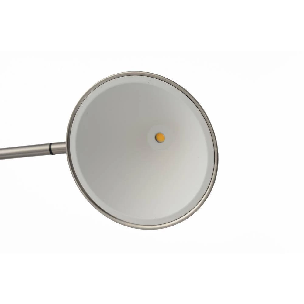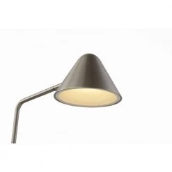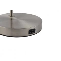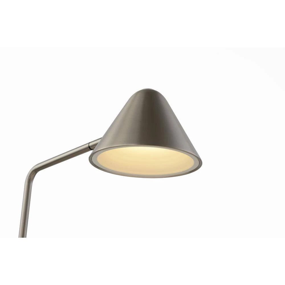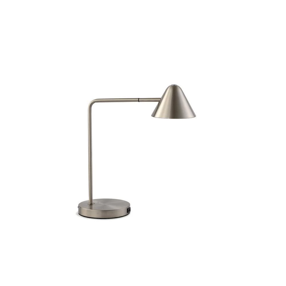 Highlight the modern flair of a home office or living area with this sleek and chic satin nickel LED table lamp. Beautiful lines include a round base and angular arm that bends at a 90-degree angle. A conical shade crafted in metal directs light in a downward direction, perfect for tasks. Energy-efficient, this task lamp is allowing for easily adjusted light levels to fit every occasion. An unobtrusive USB resides the lamp’s base, creating as easy place to charge electronic devices. Functional, adjustable, bright, reading, LED, USB, bright, sustainable, energy-efficient,. USB port – Easy access to charge your phone or other devices. Long lasting, energy efficient, LED illumination excellent for reading Coved shade offers soft reflected light. Adjustable to put the right amount of light right where you want it. Classic Contemporary design and LED technology. Reduces eye strain