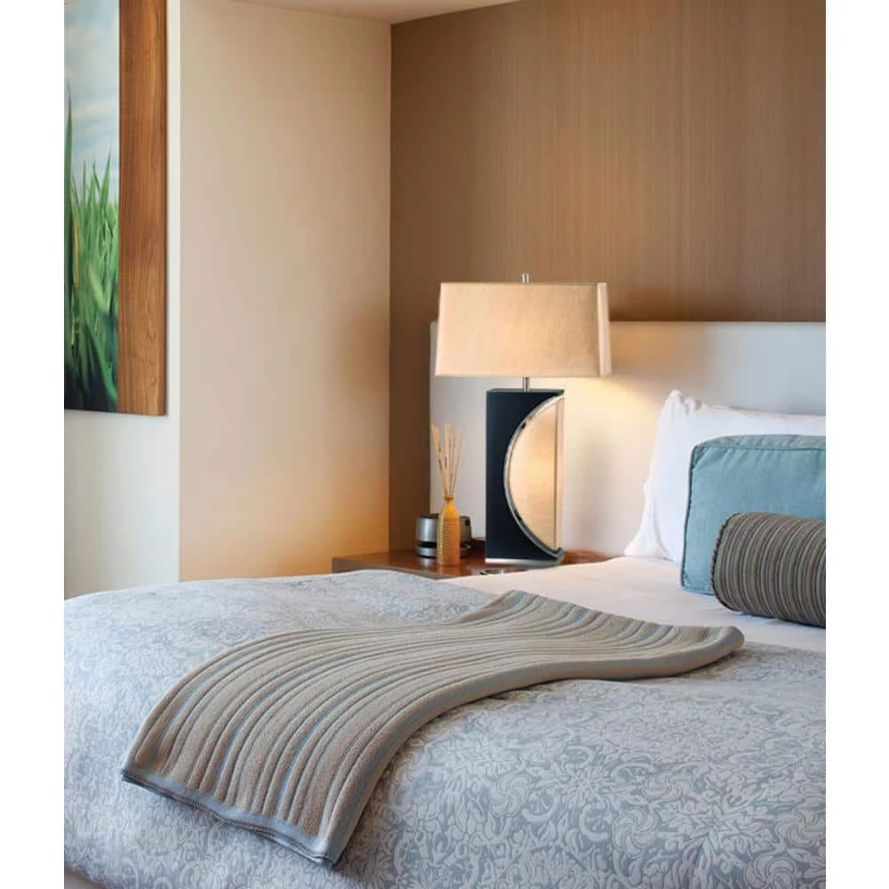 A must-have for the transitional living space, this chic table lamp is made with real wood contrasting ash gray with a white half-moon. Smartly balanced by a rectangle linen shade for functionality on your table or desk. It is designed to bring together style and convenience, with a 4-way rotary switch that allows you to choose the tone of your room depending on your mood and company.