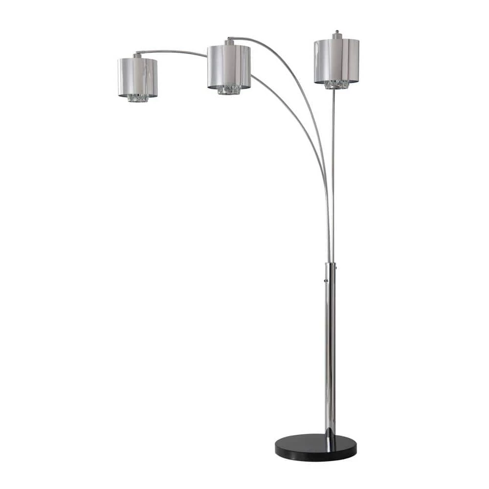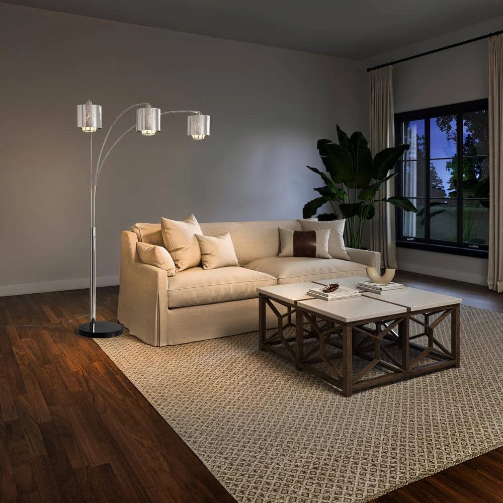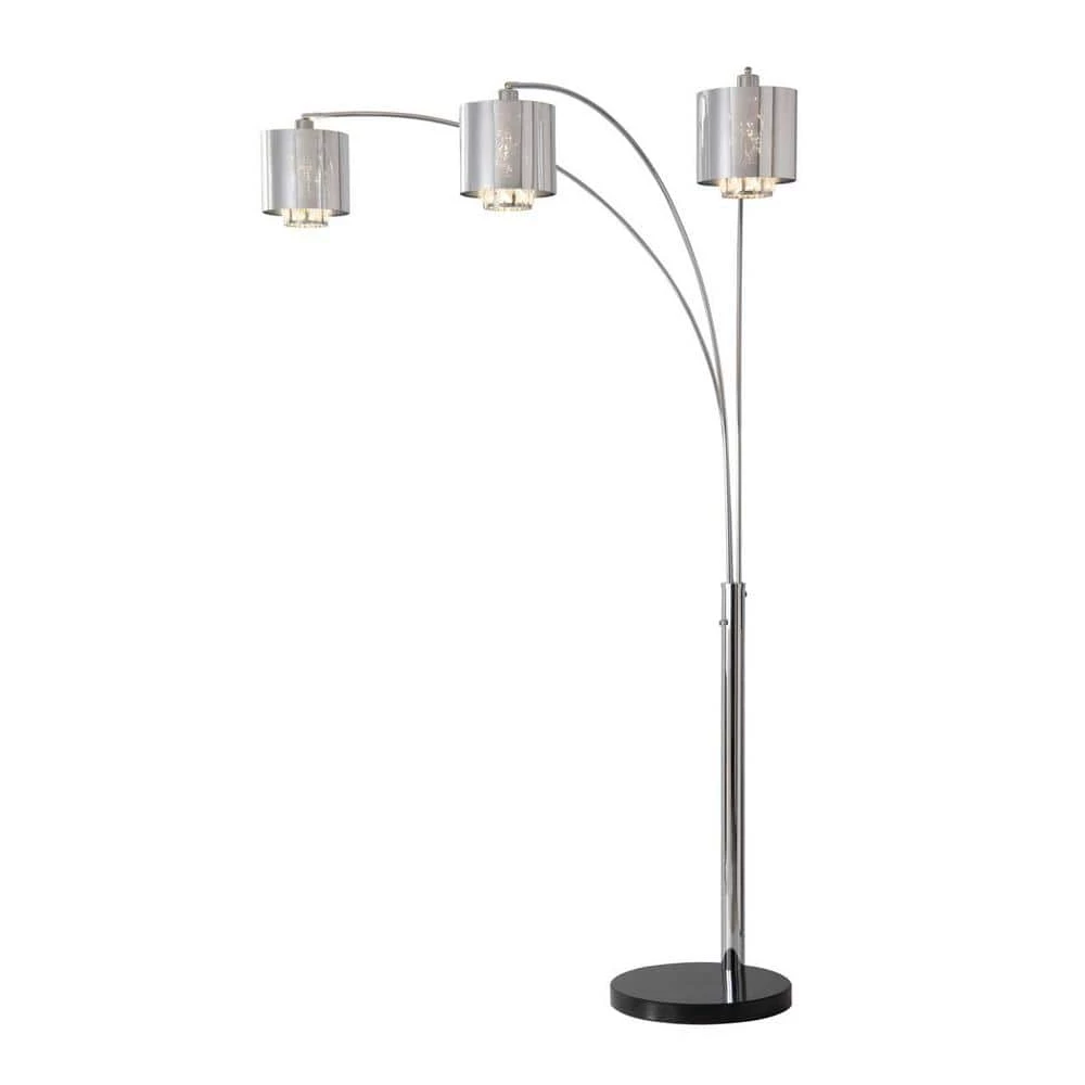 The Marilyn 3-Light Arc Lamp features cut crystals hidden behind sleek mylar shades. When turned on, the crystals shimmer and glisten, creating a pattern of light. When turned off, the mylar shades become opaque. Finished in polished chrome, the Marilyn 3 Light Arc is a glamourous, modern and dazzling addition to living spaces. When used in conjunction with a smart switch, Marilyn 3-Light Arc is compatible with Google Assistant and Apple Home and can be automatically turned on/off manually, by voice activation or by scheduled settings.