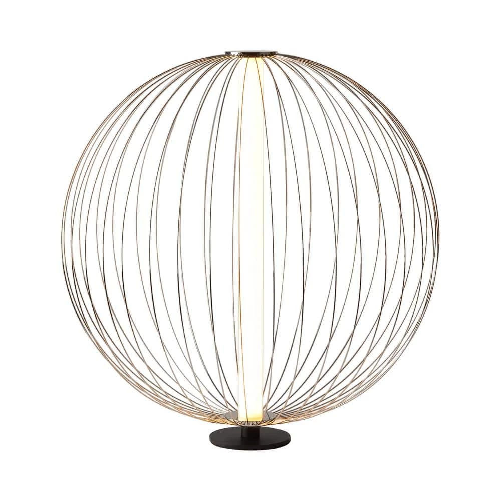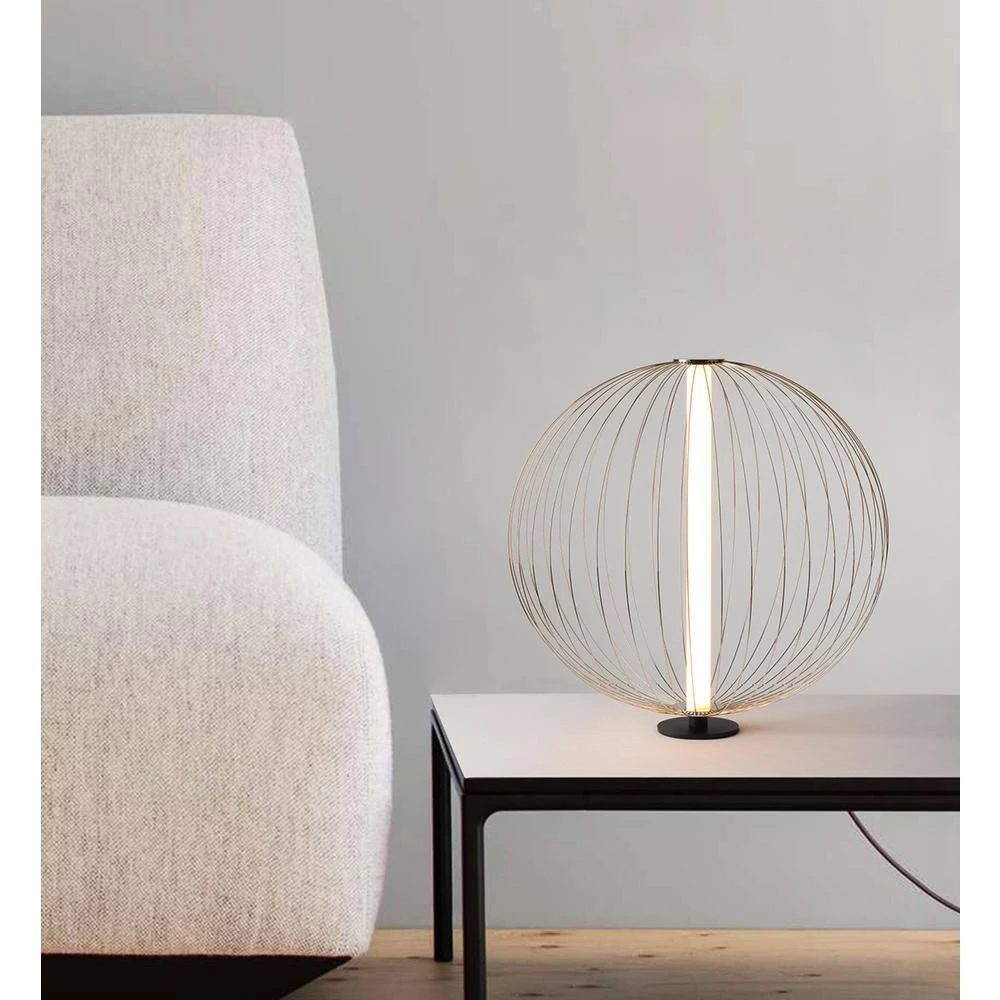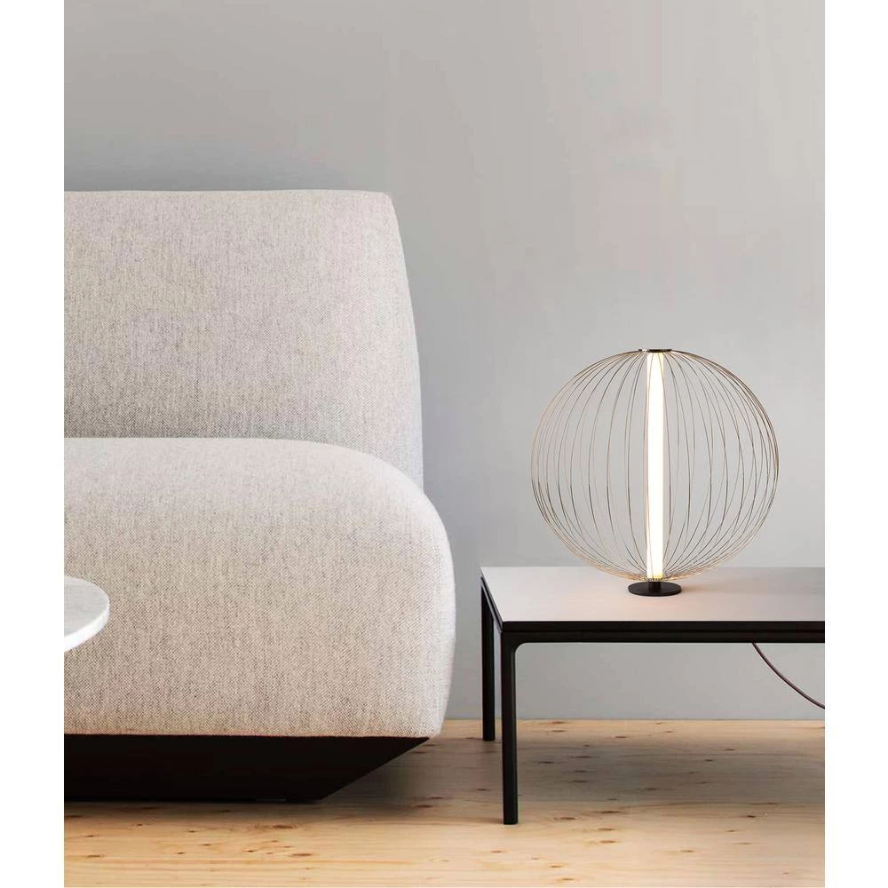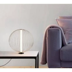 Bring a modern sculptural element into your lighting design with the Spokes Table Lamp Round Small Satin Nickel. Soft, ambient light emanates from a central tubular LED diffuser, perfect for adding a subtle glow to your contemporary decor. Encircling the LED light is an elliptical cage constructed of piano wire for an unexpected element. This LED lamp is a perfect complement at the bedside or on an accent table. Material: modern, sculptural, ambient, LED. Long lasting, energy efficient, LED illumination excellent ambient light for corners. Innovative piano wire construction. Slim line and elegant. For living room, bedroom or study.