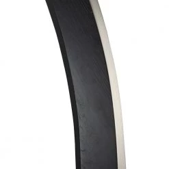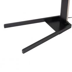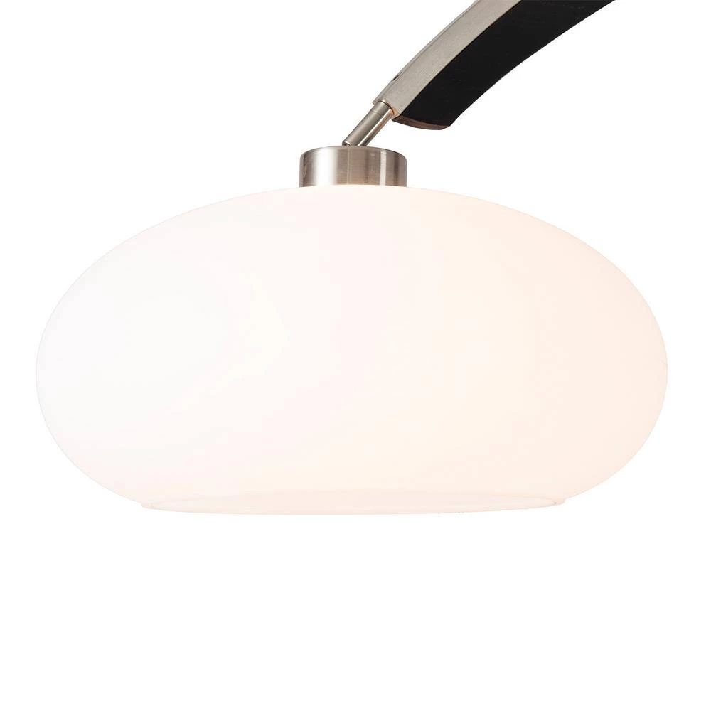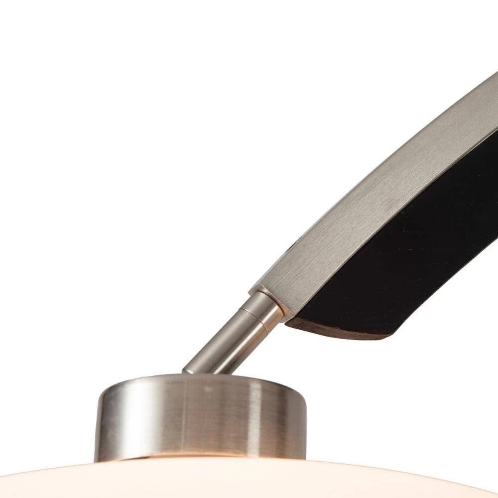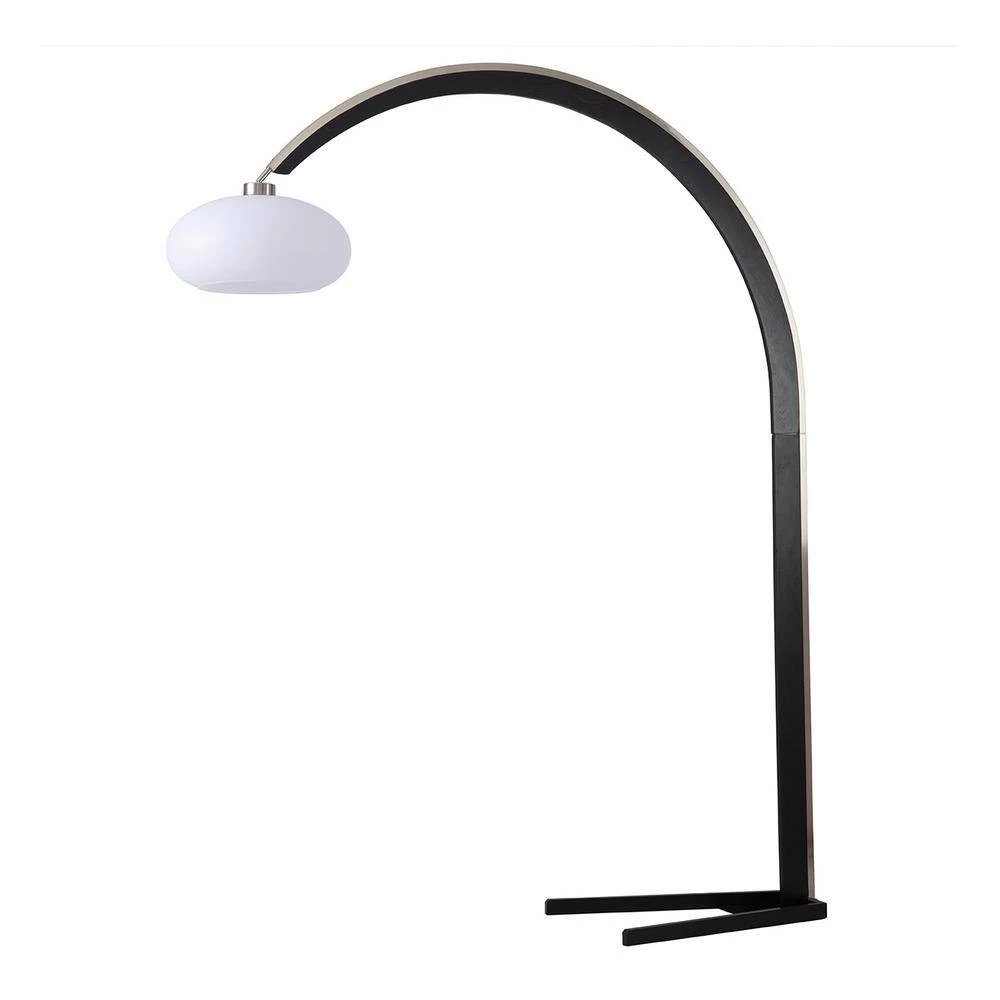 - Matte black wood finish arc with satin nickel accents, molded acrylic shade