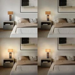 Adding elegance to your bedside. This transitional Ventana Table Lamp with a dark brown and brushed nickel finish and a soothing tan elephantine parchment shade will induce an extraordinary vibe to your room. This NOVA of California design comes equipped with a 4-way rotary switch to help you adjust the tone of your room as you like.