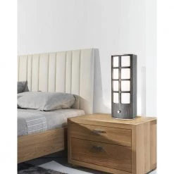 This discreet accent table lamp provides stylish lighting housed in a unique setting. Crafted from real wood finished in charcoal gray, this transitional lamp balances elegant artistry with charming functionality by revealing dimmable ambient light through translucent window panes. Finished off with steel details. NOVA lighting creates a wide variety of reasonably priced stylistic lighting pieces, perfect for varied contemporary living spaces.
