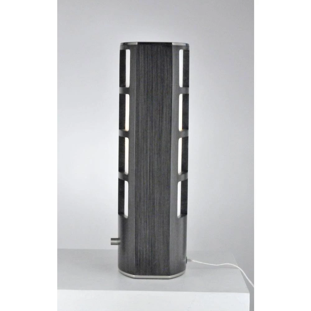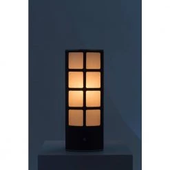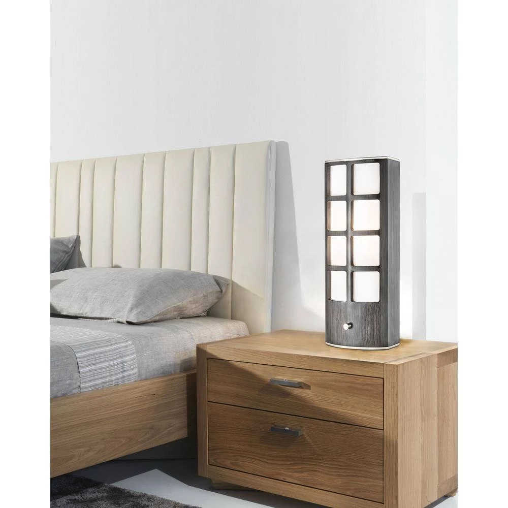 - Stylistic lighting pieces crafted from real wood finished in charcoal gray, this transitional lamp balances elegant artistry with charming functionality by revealing dimmable ambient light through translucent window panes